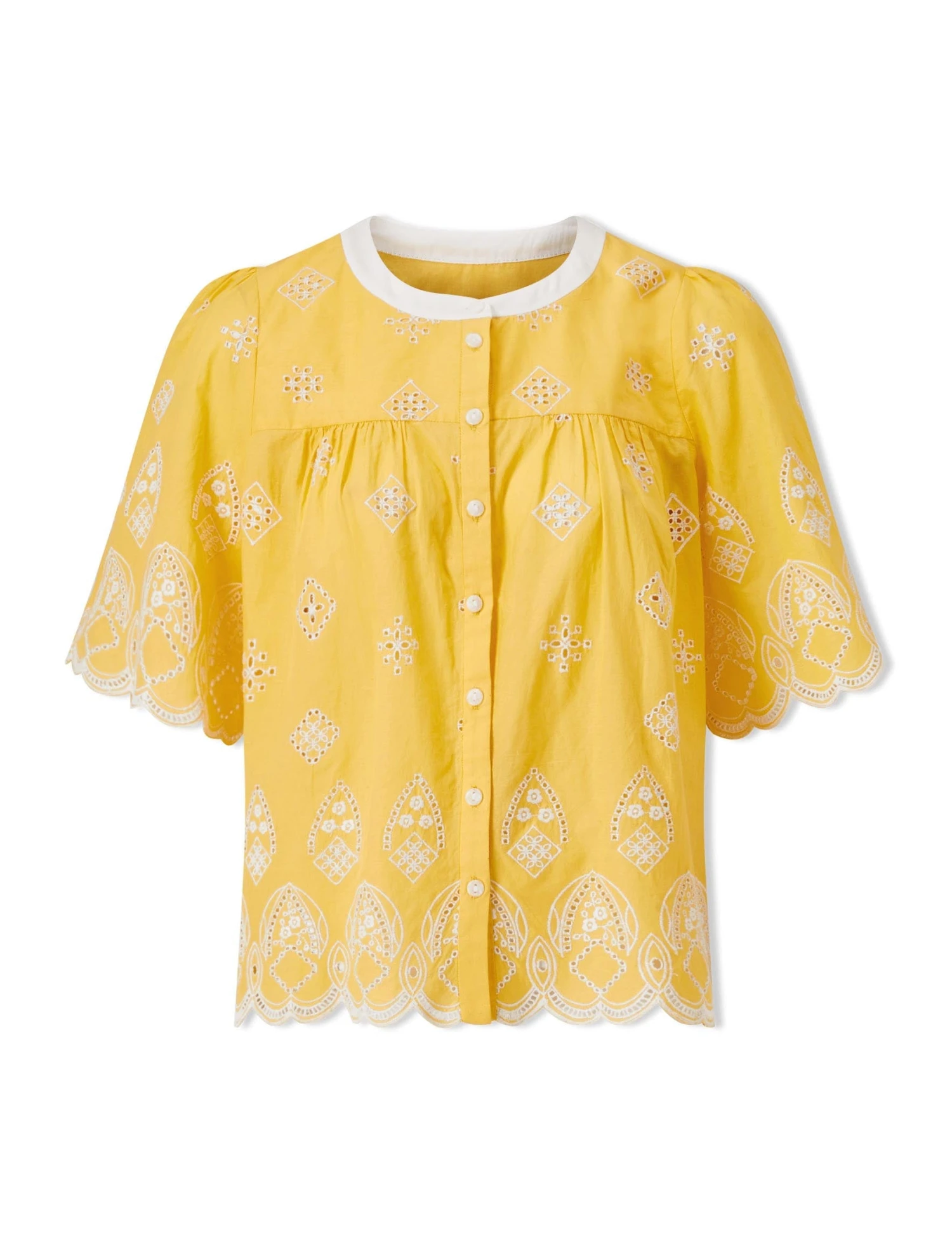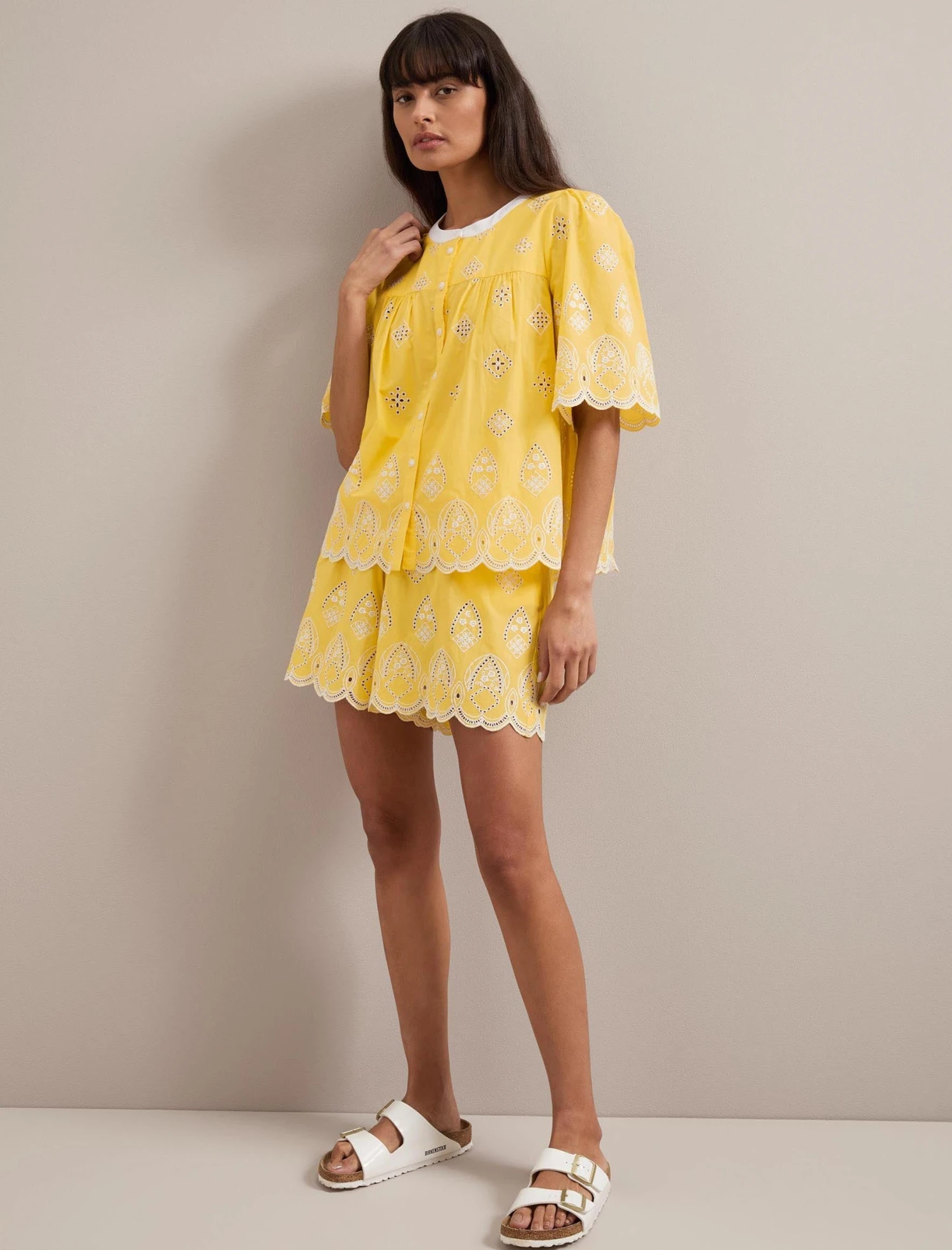 Bonnie by name and bonnie by nature, this buttercup broderie anglaise blouse epitomises the spirit of summer. Made from a light, airy organic cotton that has been washed for extra softness, it features delicately scalloped sleeves and hem. Wear with denim or white separates, or co-ordinate with the matching Bonnie shorts to see you through balmy beach days in style.