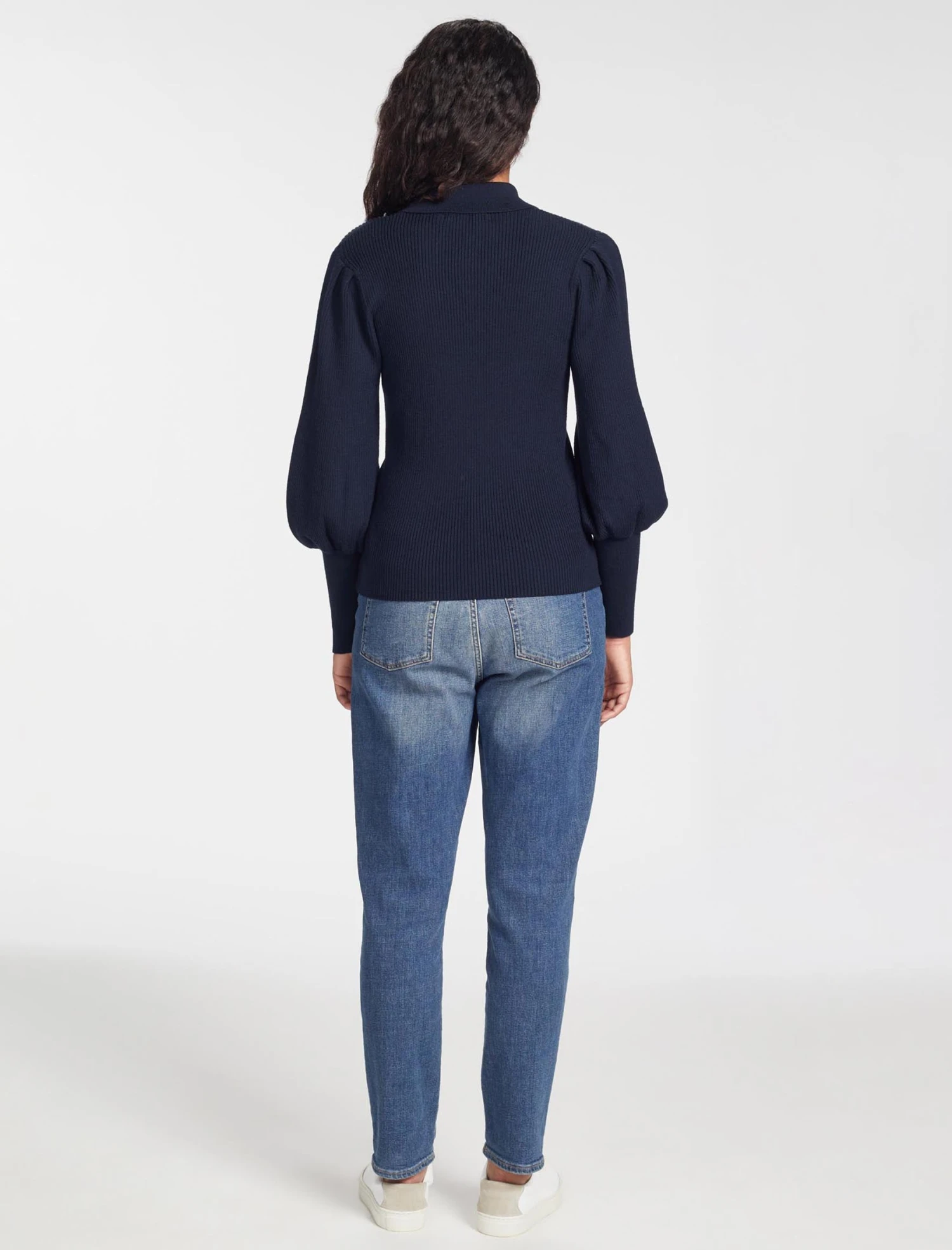 We’ve reworked our hero Eva top for FW23 with a polo-style neckline for effortless versatility. It’s designed in a soft merino-wool rib with added stretch to create a slimming silhouette, while the fitted cuff blouson sleeves add shape and volume. The perfect knit for when you want to feel pulled together, wear it with our leather Tiana skirt or any of our tailored trousers.