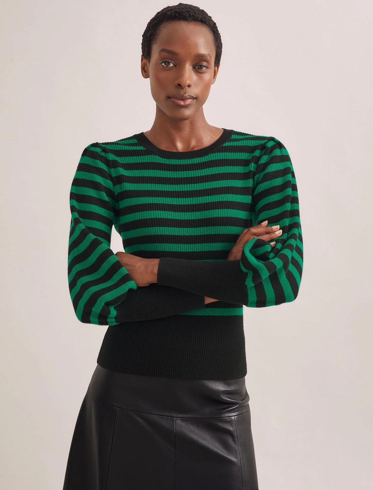 We’ve reworked our hero Eva style with a classic crew neckline for effortless versatility. The merino rib creates a slimming silhouette, while the fitted cuff blouson sleeves add feminine shape and volume. The ultimate pulled together knit, the Eva is the perfect alternative to a jacket and shirt. Wear with our leather Tiana skirt or any of our tailored trousers.