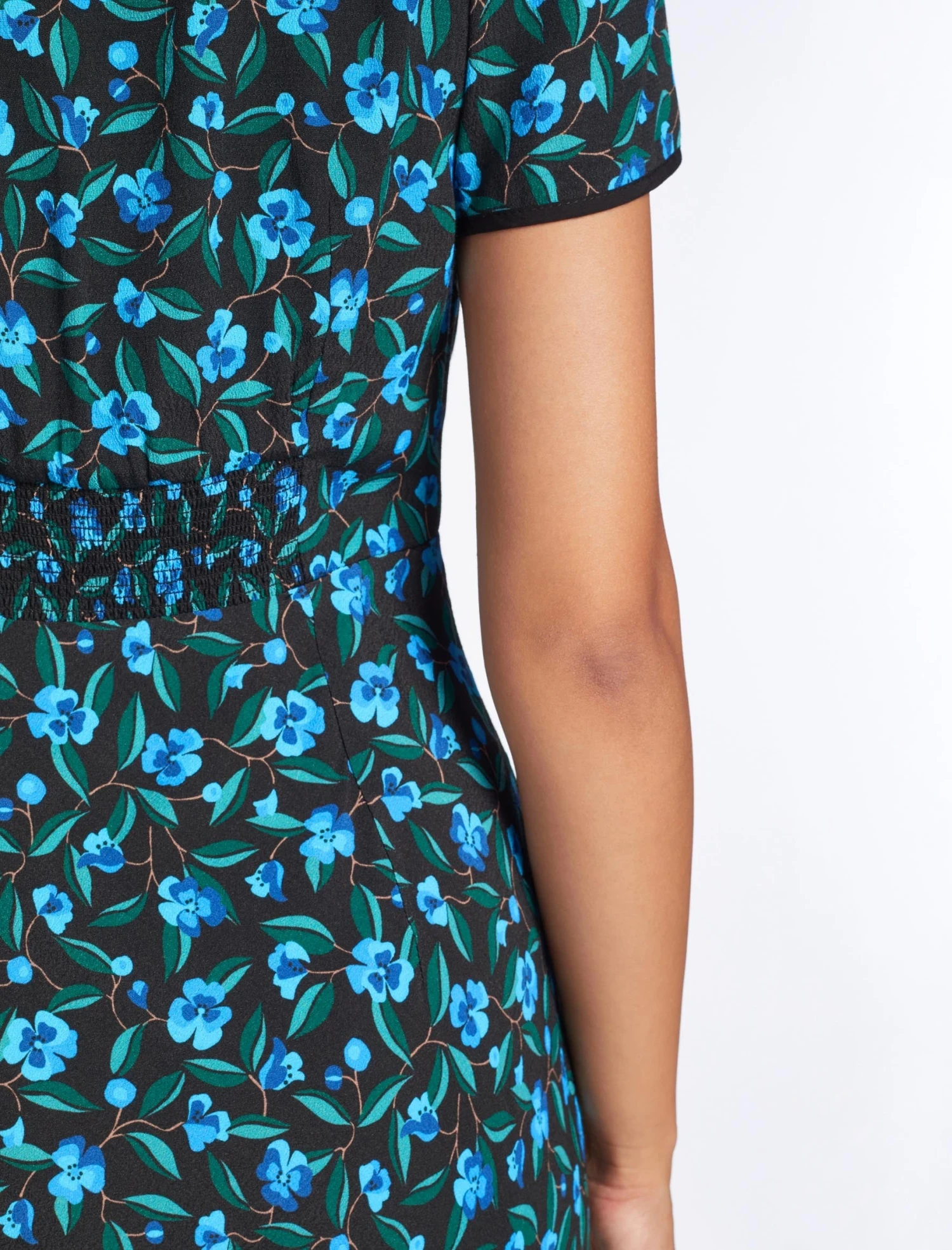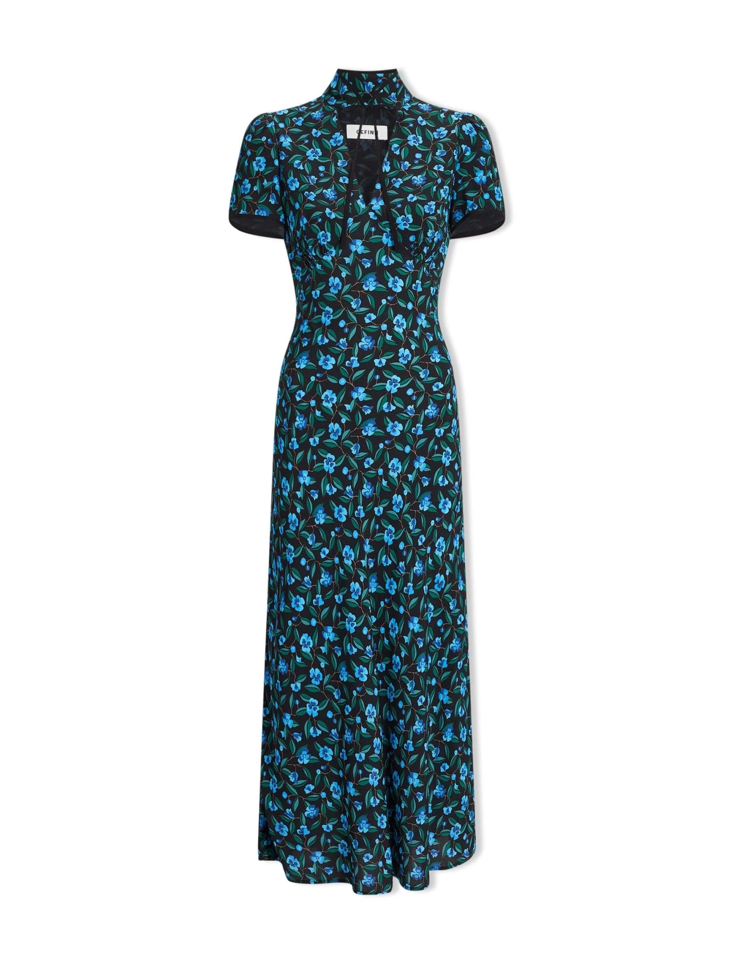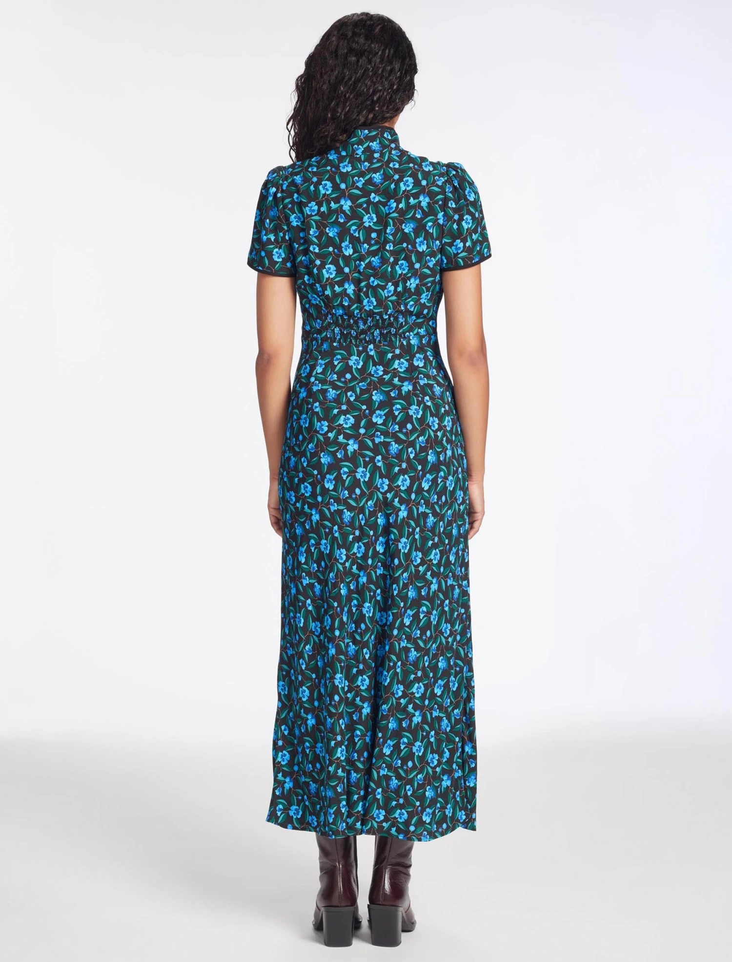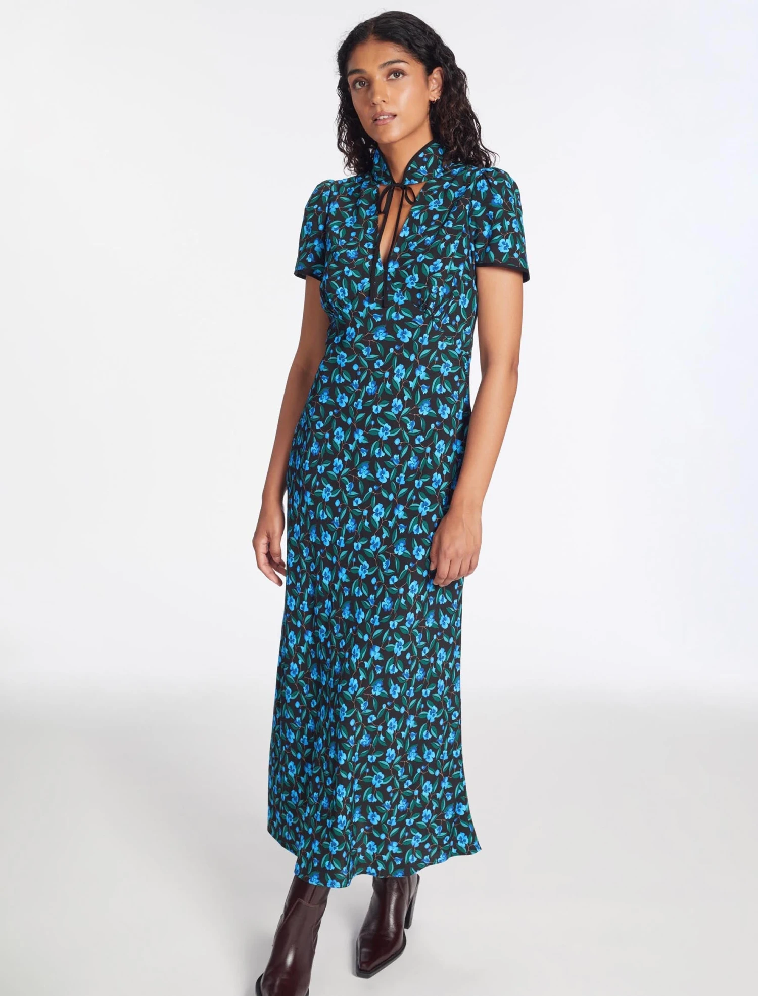 This is a dress with poise and panache. A best-seller from AW22, we’ve revisited Jacquetta in a lightweight viscose crepe with our standout deco floral print. The flattering bias-cut skirt, short sleeves and signature tie collar elevate it for formal events. A late summer show-stopper, add a dramatic flourish with a strappy heel and a striking red lip.