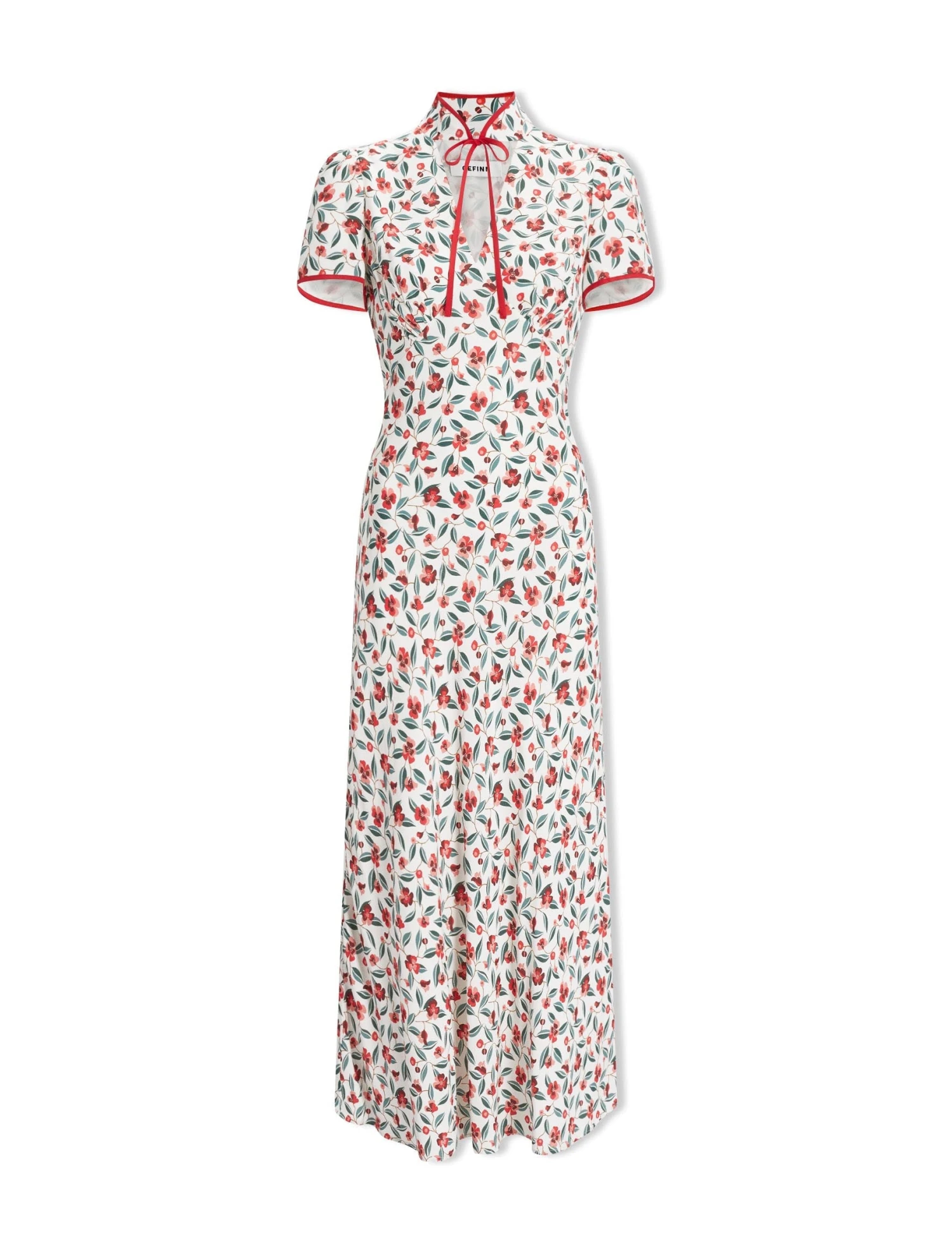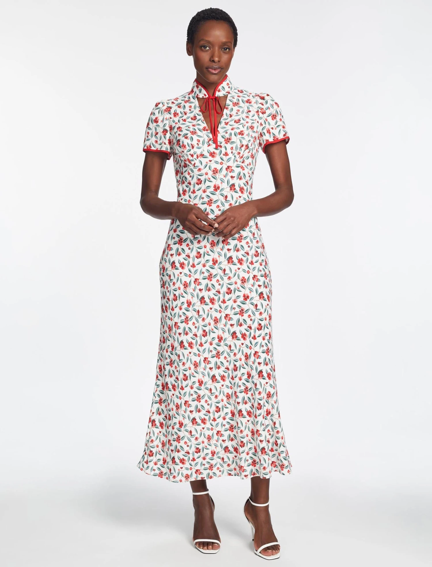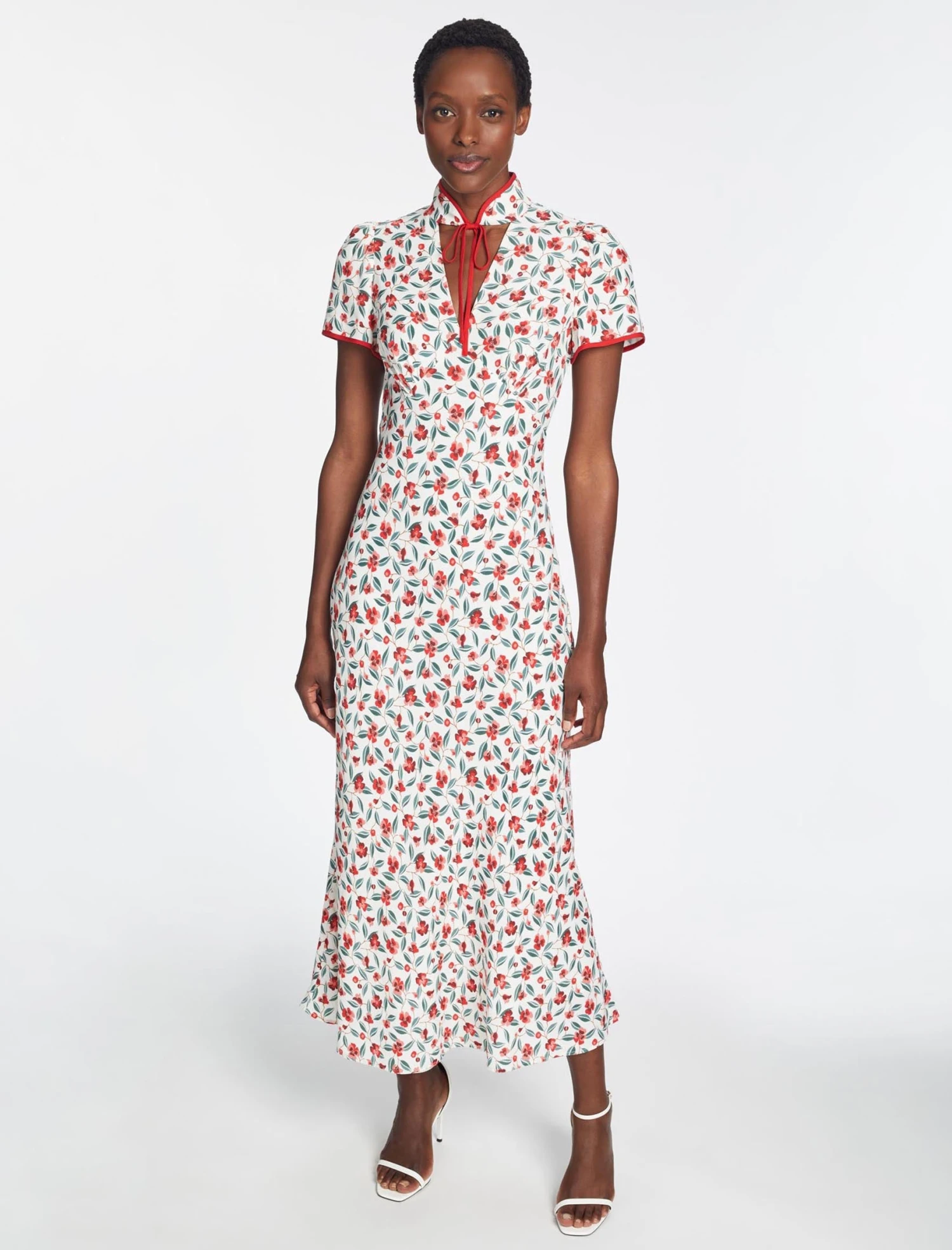 This is a dress with poise and panache. A best-seller from AW22, we’ve revisited Jacquetta in a lightweight viscose crepe with our standout deco floral print. The flattering bias-cut skirt, short sleeves and signature tie collar elevate it for formal events. A late summer show-stopper, add a dramatic flourish with a strappy heel and a striking red lip.Â