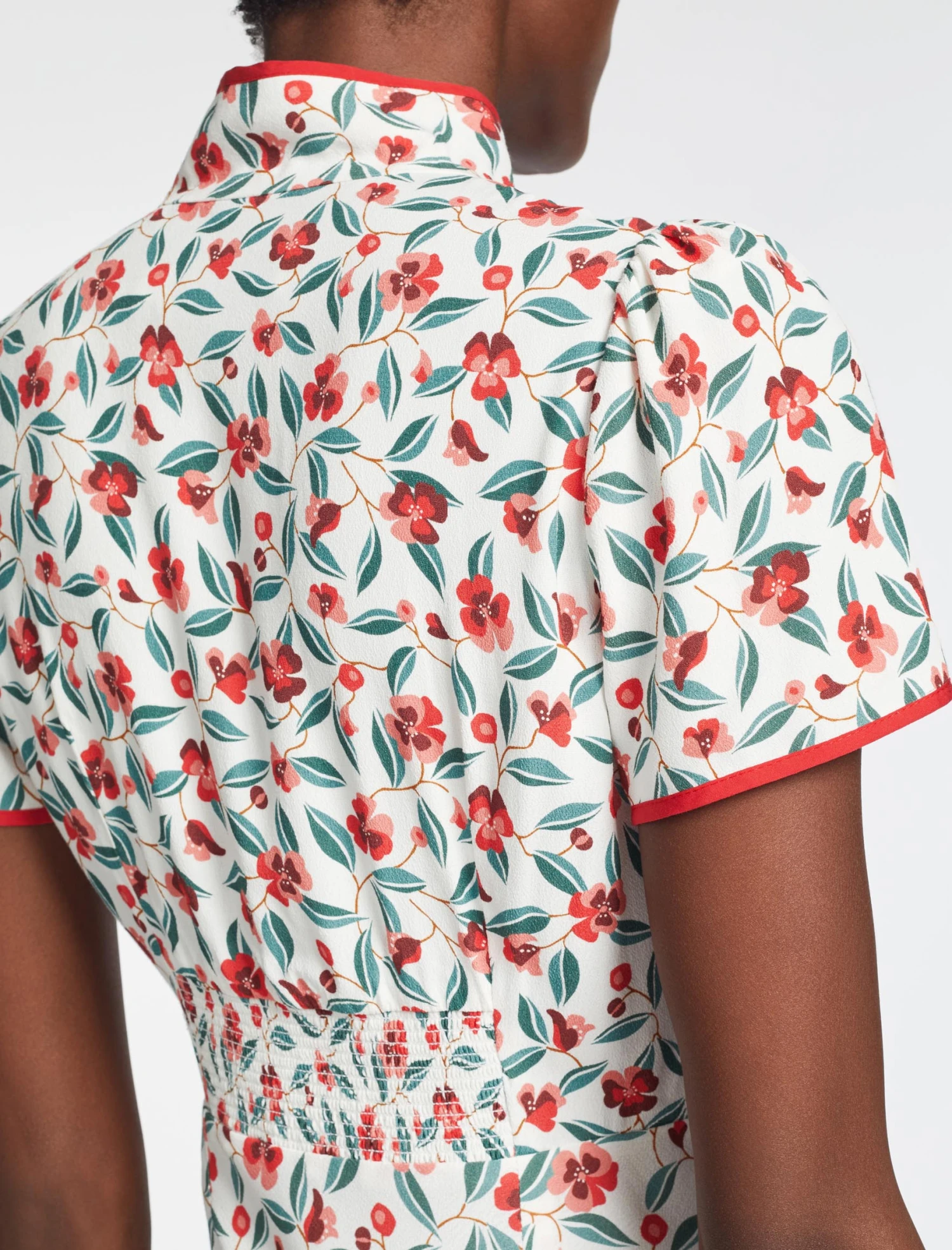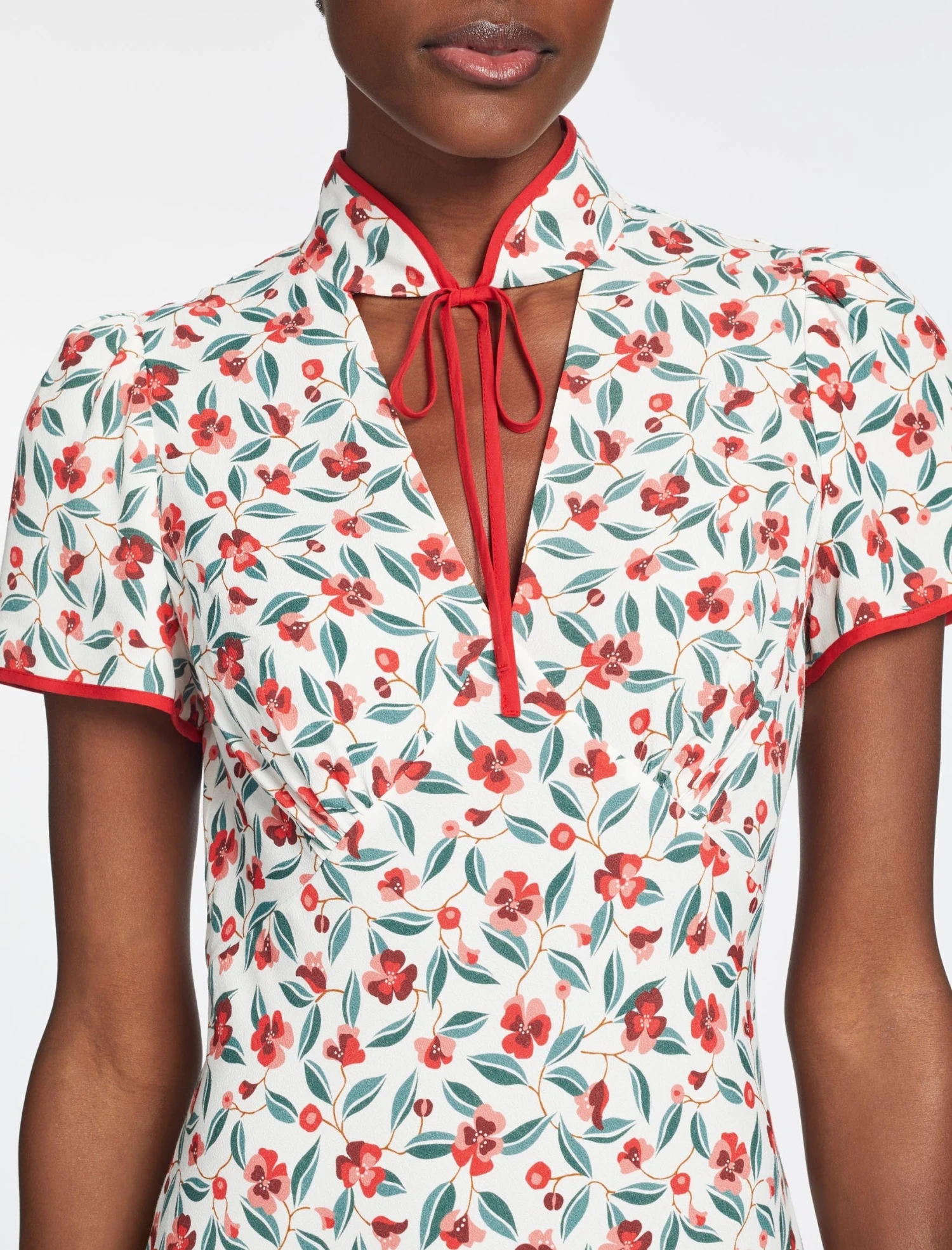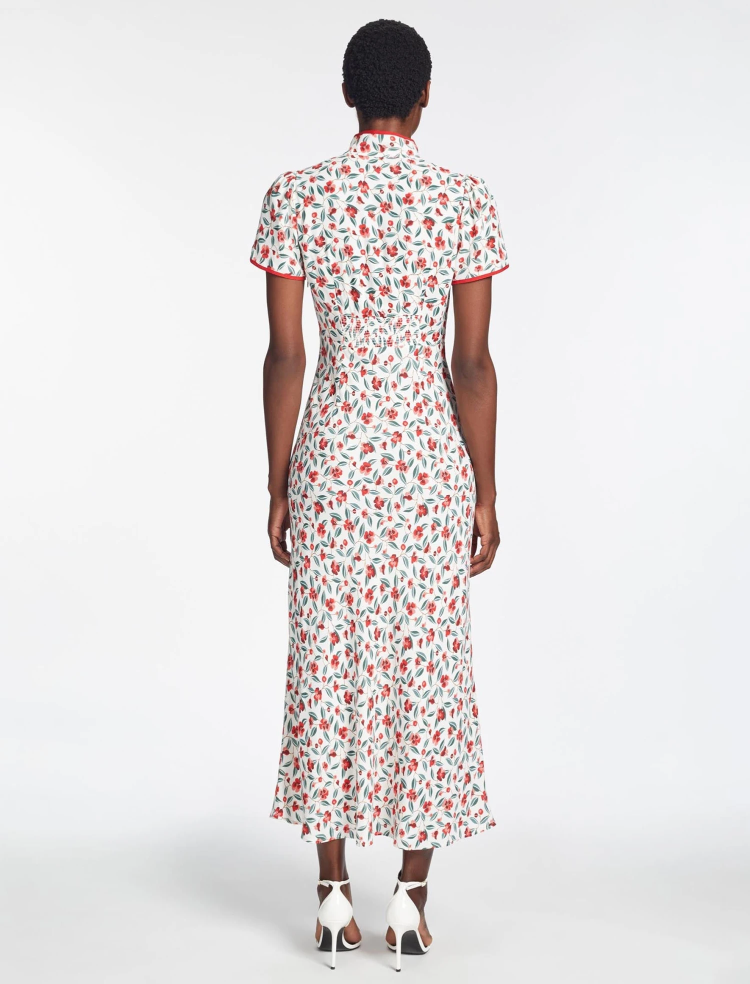 This is a dress with poise and panache. A best-seller from AW22, we’ve revisited Jacquetta in a lightweight viscose crepe with our standout deco floral print. The flattering bias-cut skirt, short sleeves and signature tie collar elevate it for formal events. A late summer show-stopper, add a dramatic flourish with a strappy heel and a striking red lip.Â