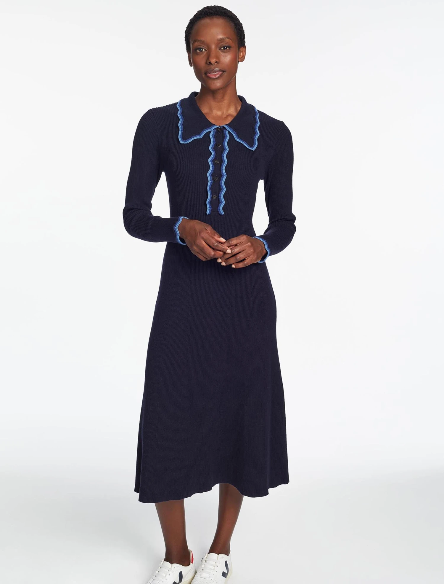 Who doesn’t love the ease of a knitted dress? We’ve revisited our bestselling knitted dress in a wool-and-cotton blend that is the ideal weight and feel when the temperature starts to slowly creep up. A classic Eva shape with Josie’s contrast placket and cuffs give it a contemporary twist.