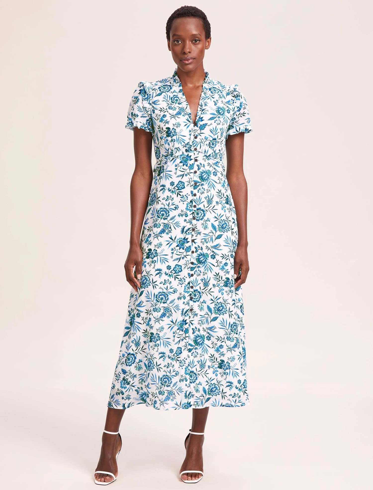 The Liliana dress flatters a multitude of figures thanks to its high waistline, which allows the beautifully drapey cotton viscose georgette to skim gently over the hips. Practical as well as pretty, the rouleau summarys are stitched down through the bust and waist to avoid gaping but can be opened at the bottom to reveal more leg.