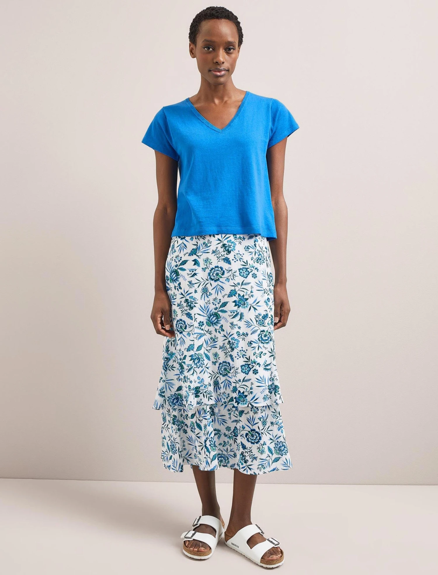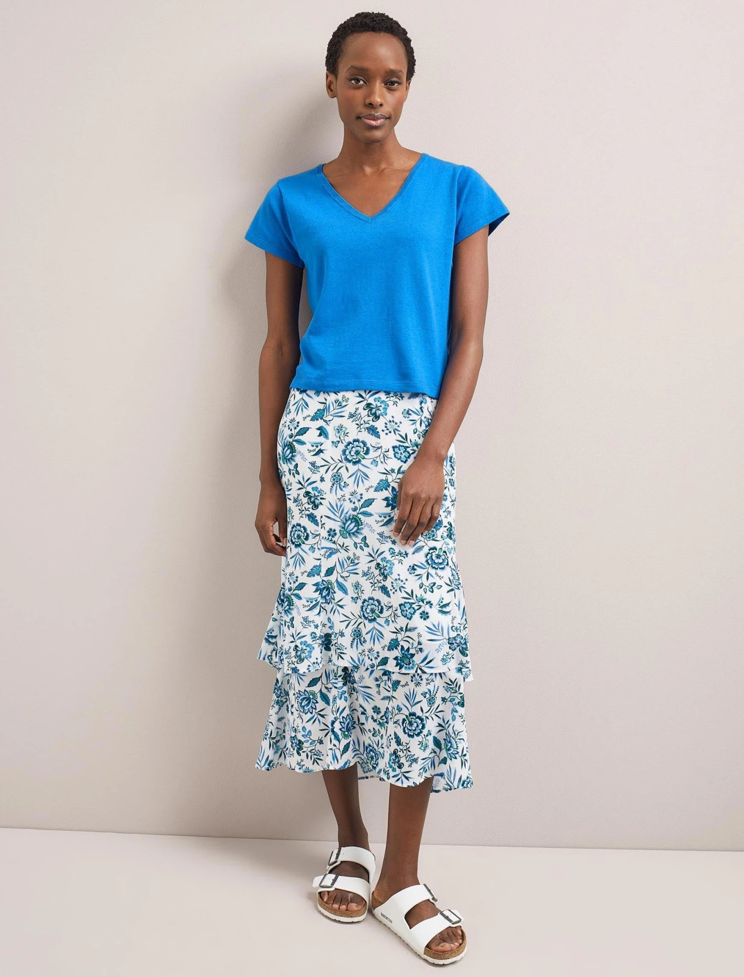 Anything but basic, our Madison T-shirt is knitted in a fine cotton linen blend that is cool and luxurious to wear. Knowing the power of a great tee as a summer wardrobe building block, we have obsessed over the fit to make sure it’s next-level– not too big or too small, the ideal length to be worn tucked or untucked, and the perfect V-neck for just the right amount of décolletage.