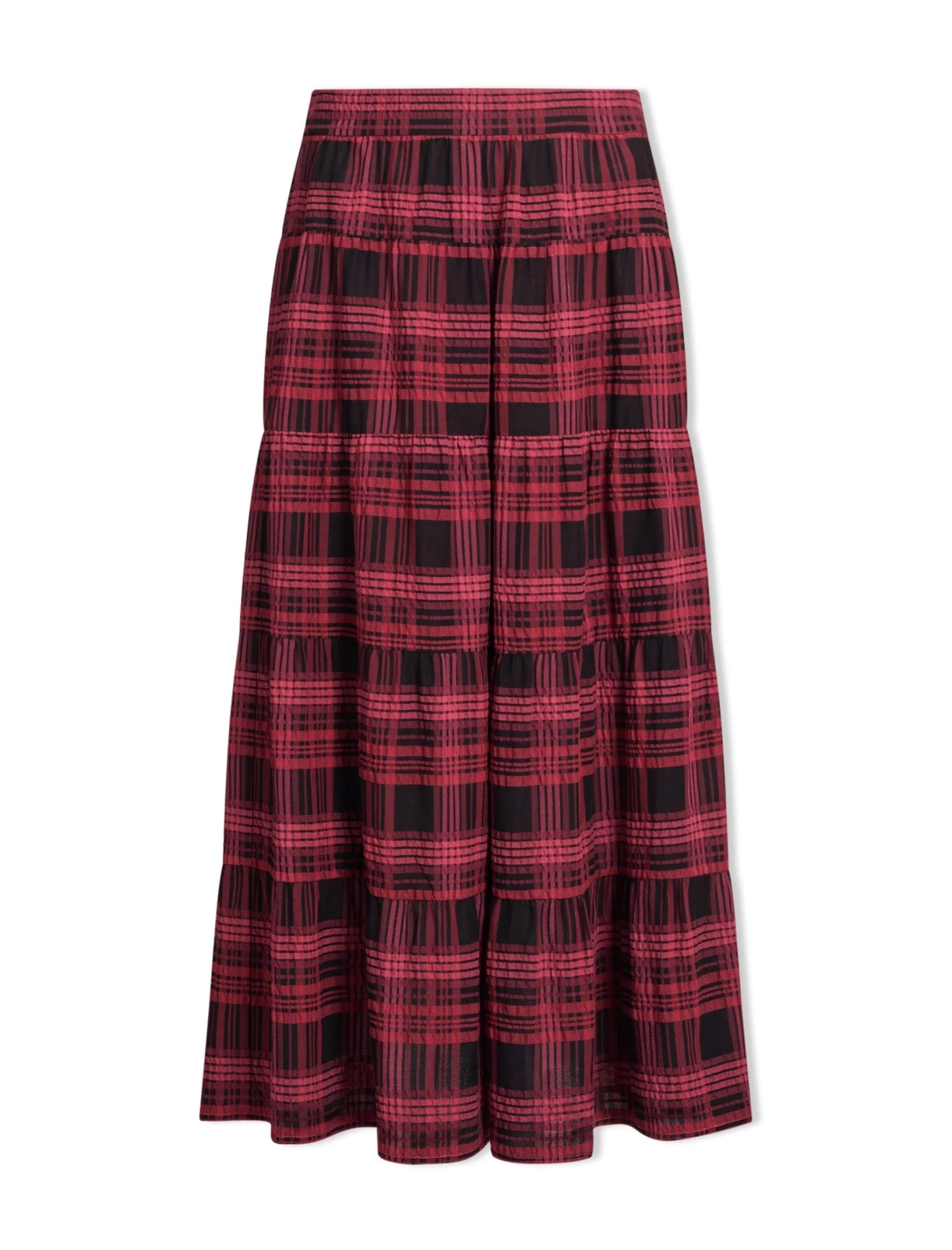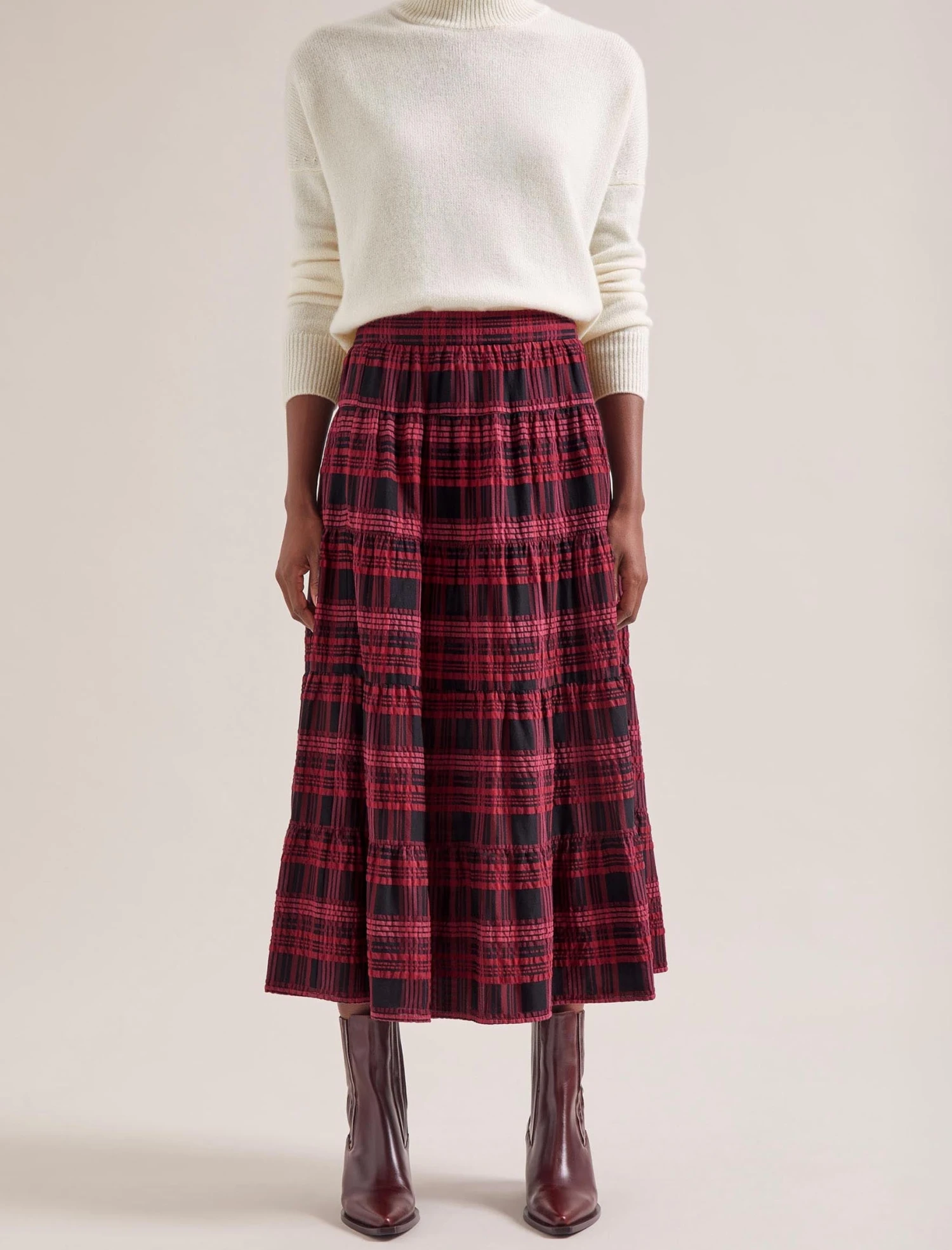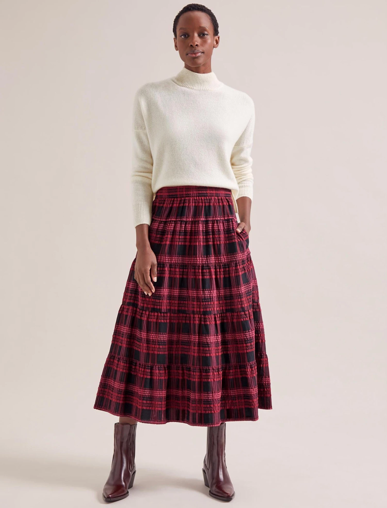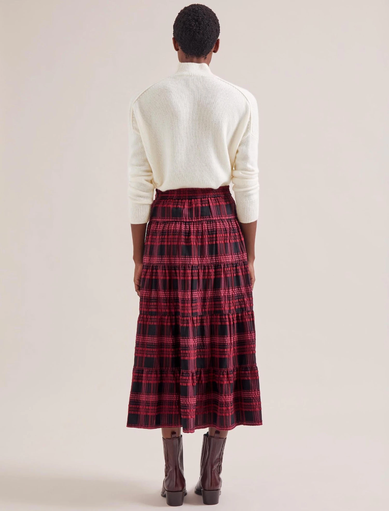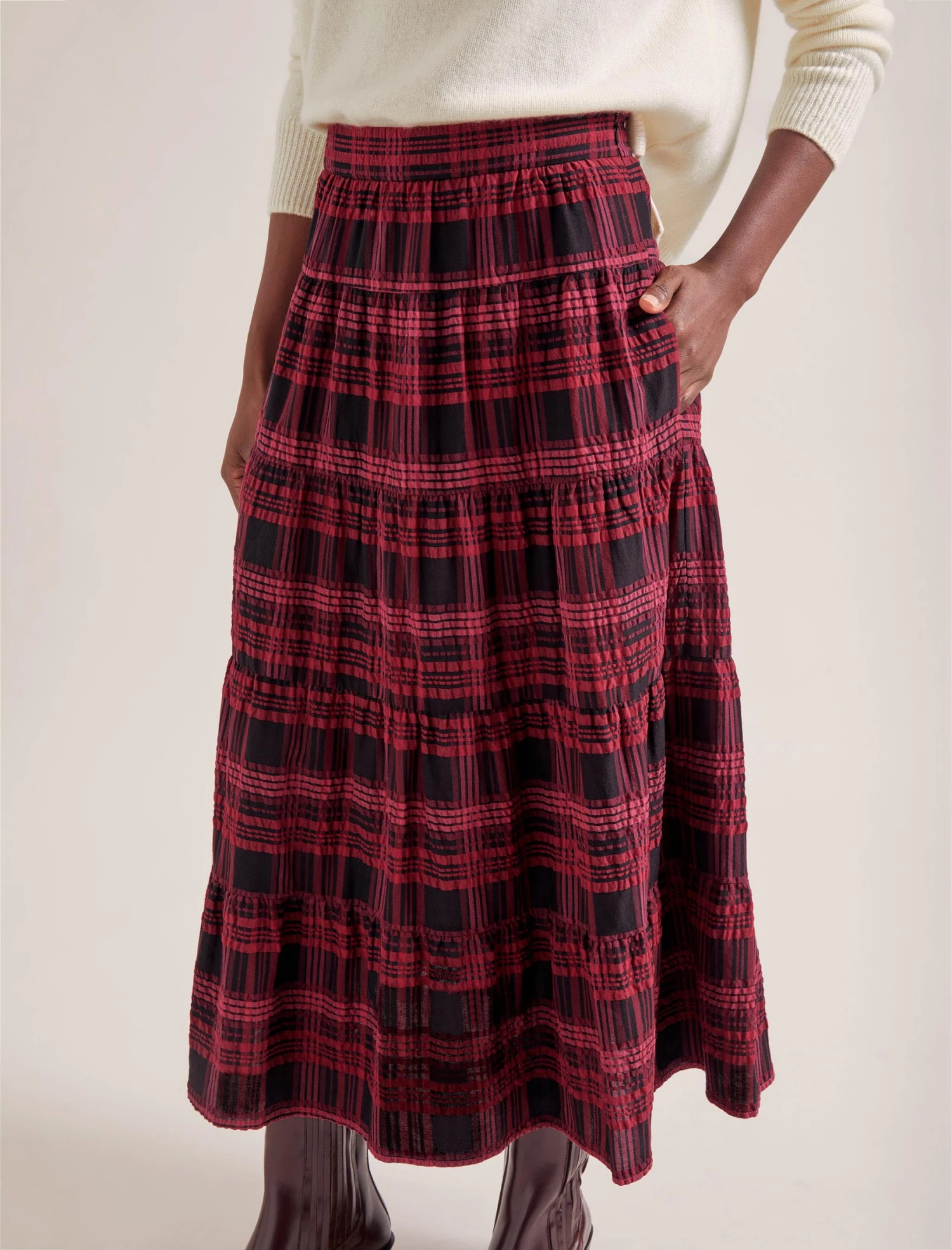 Nothing says relaxed ease quite like a seersucker skirt. Ideal for day-to-day wear, the elasticated waist, handy side pockets and tiered skirt ensure it’s both functional and fashionable. The smart check print in red and black pairs well with our Janice knit and Wesley waistcoat.