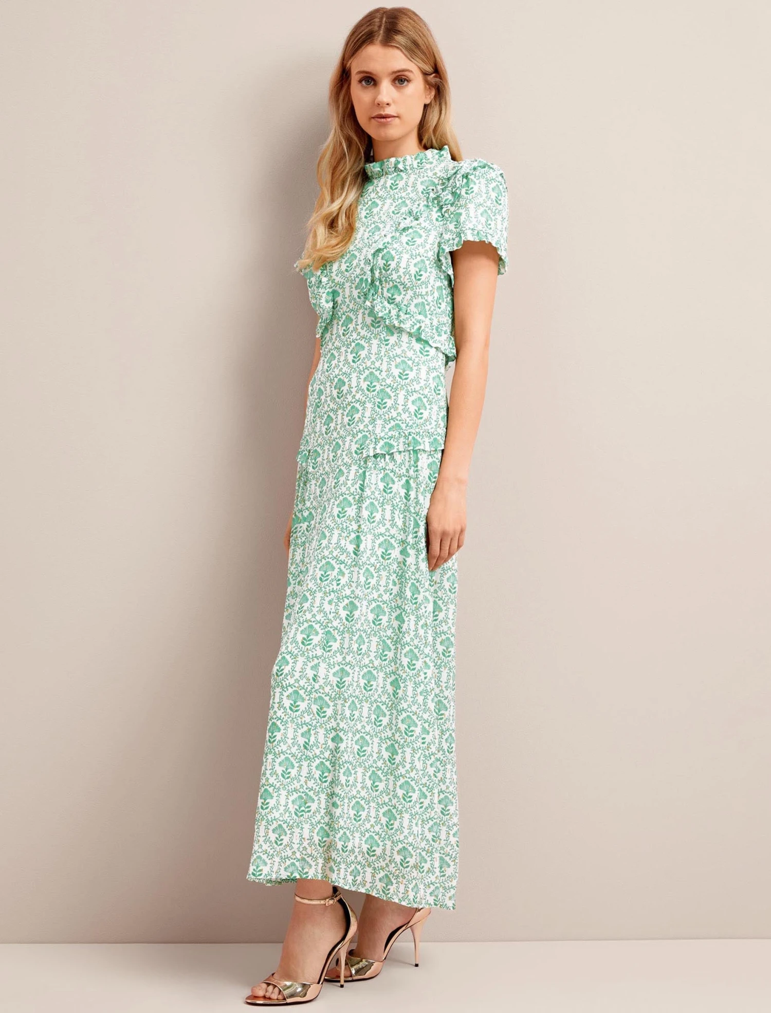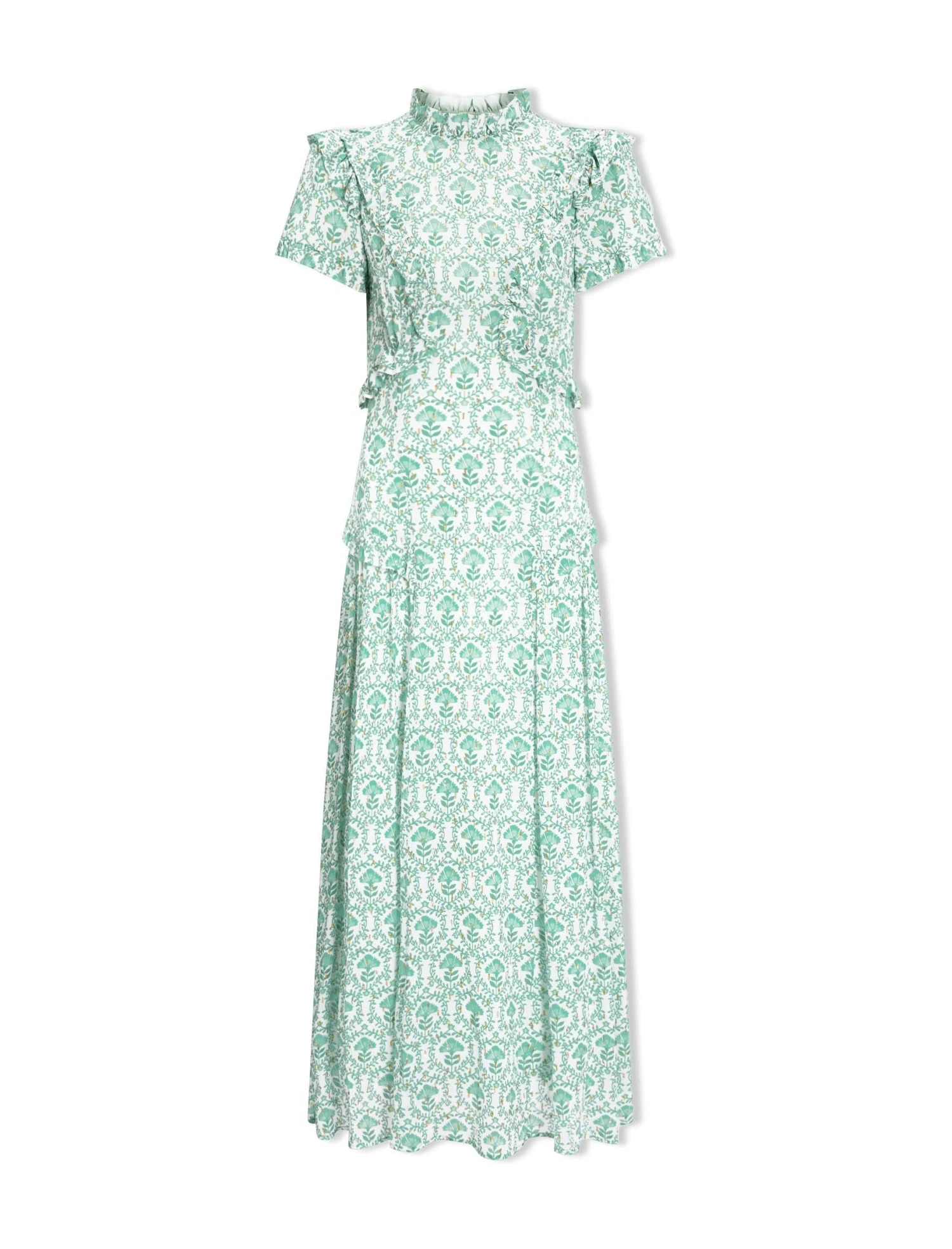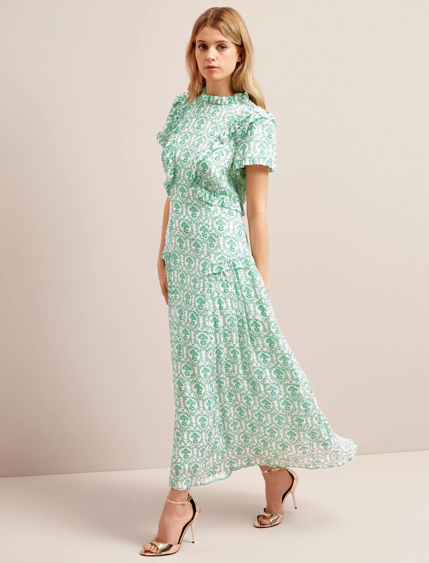 Designed in delicate georgette with shimmering gold metallic fil coupé detailing, Mirabel is the ultimate summer event dress. Fully lined yet light and airy, the contouring cut and frill placement is incredibly flattering making this the dress for a stand-out statement.