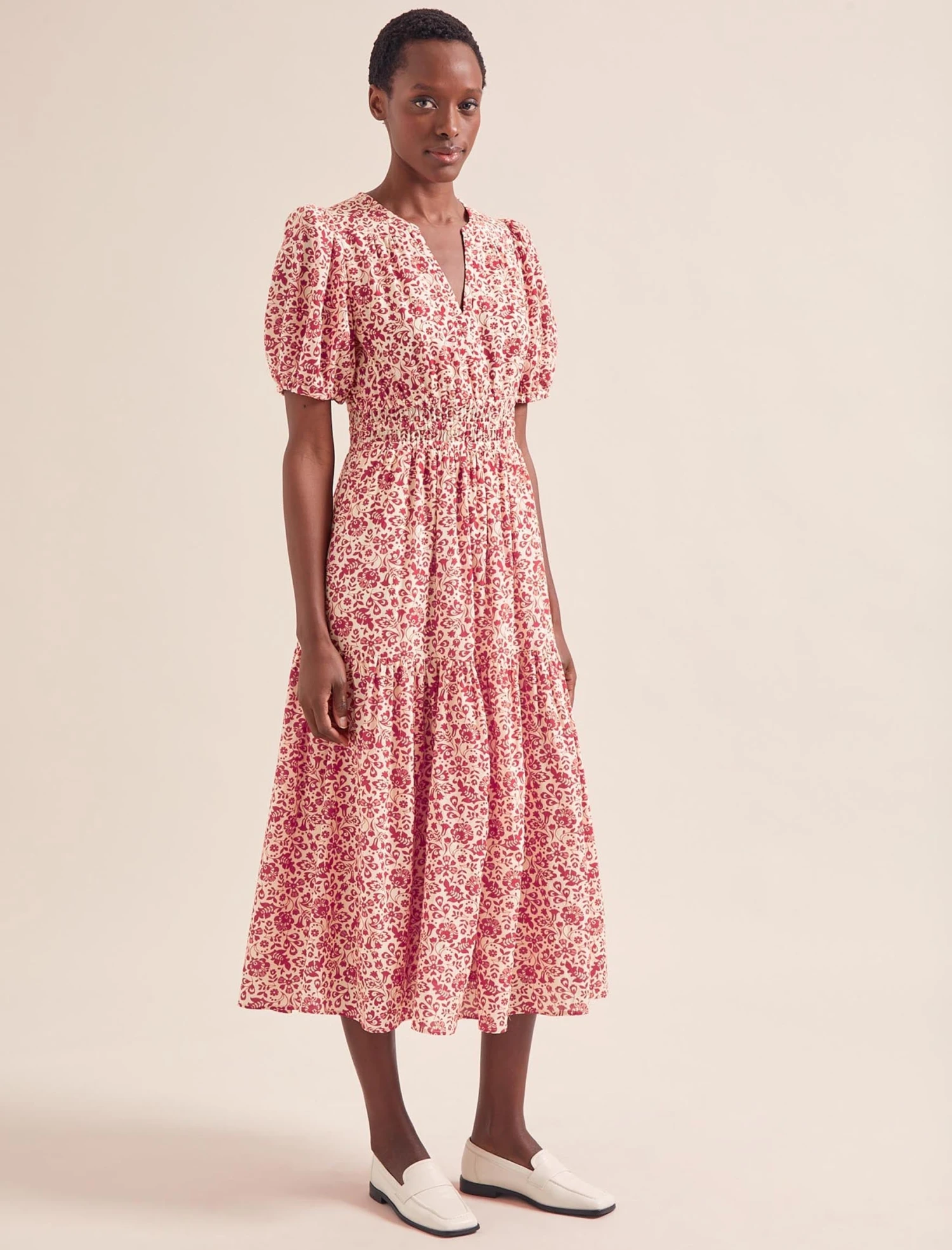 Cut in our beautifully light, soft and drapey cotton viscose voile in our latest feminine floral, Olive is a dream dress to wear. Inspired by our bestselling Evie dress, it features a nipped in ruched elasticated waist and discreet side pockets for relaxed wearability. Perfect for summery sporting events and late summer celebrations or worn casually with sandals.