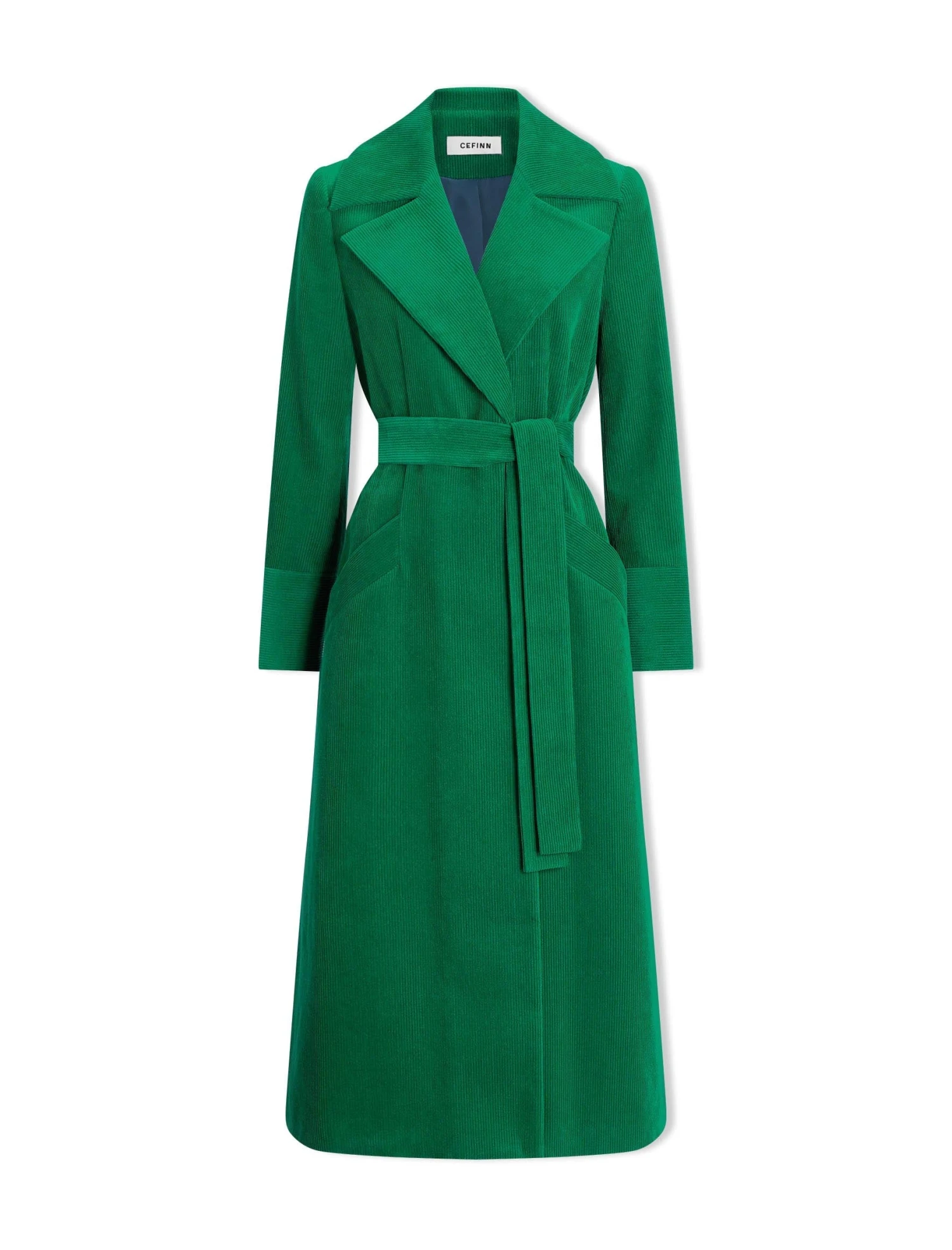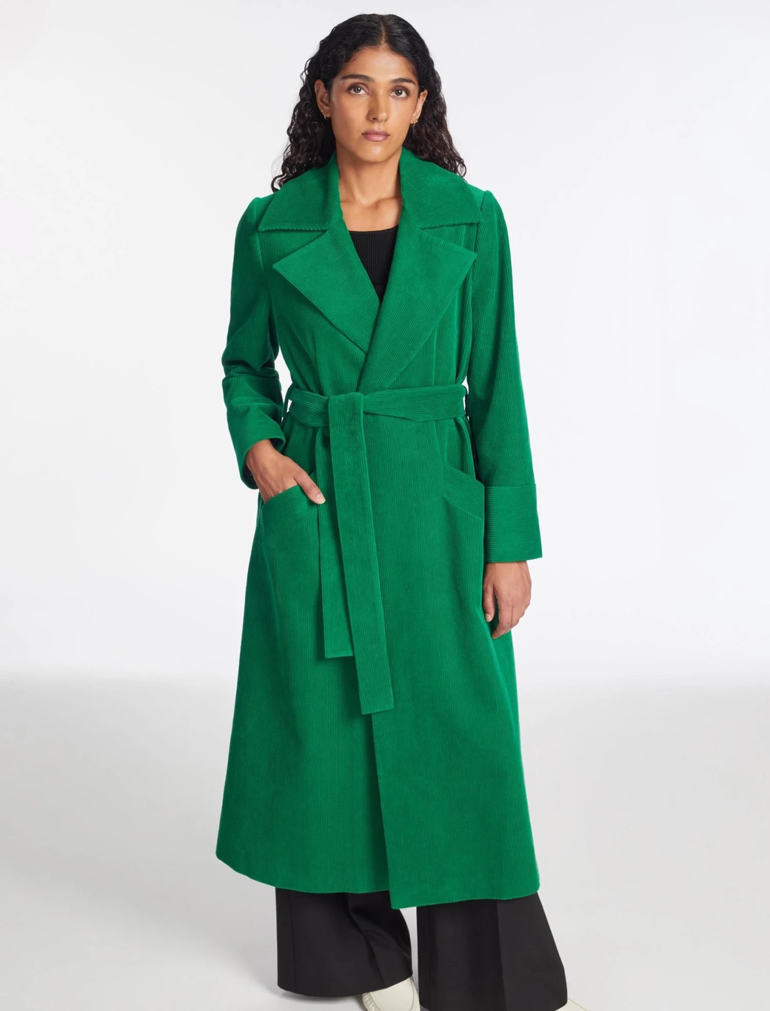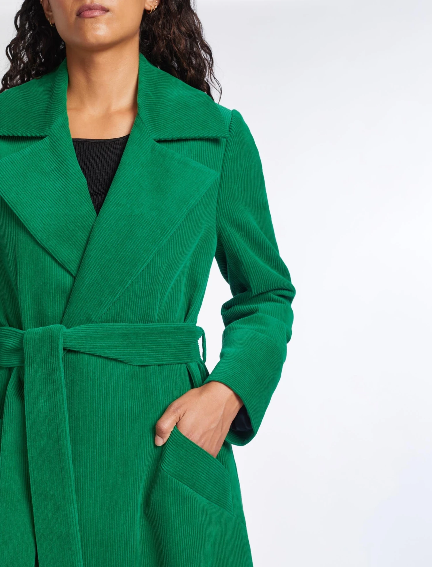 Introducing our latest Roxanne coat, perfectly tailored for the season. Crafted from a jumbo corduroy in a convenient wrap style, it features spacious pockets and a waist-defining belt. With its full-length silhouette, you can elevate your look with sleek winter boots or embrace a more relaxed vibe with causal footwear.