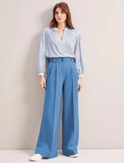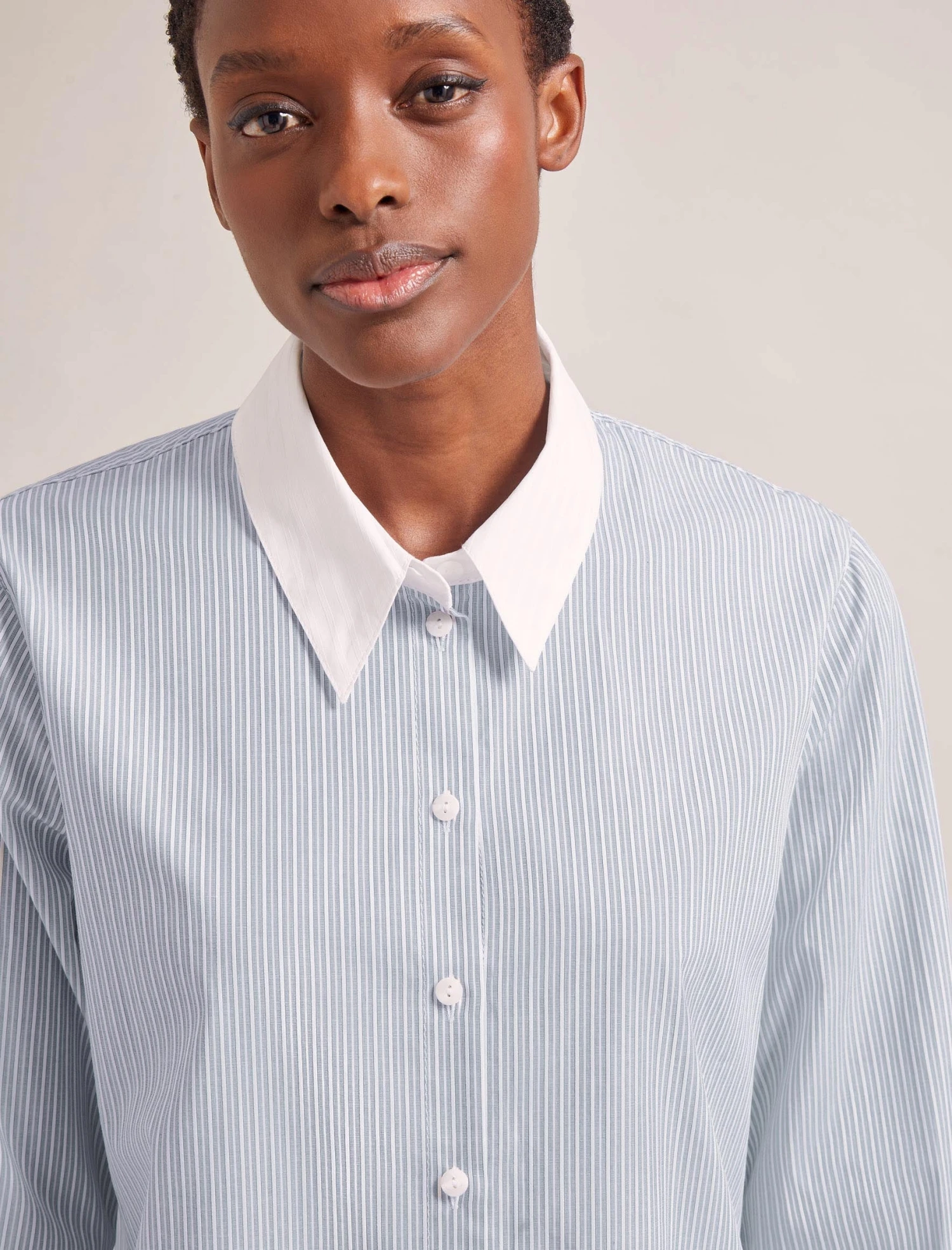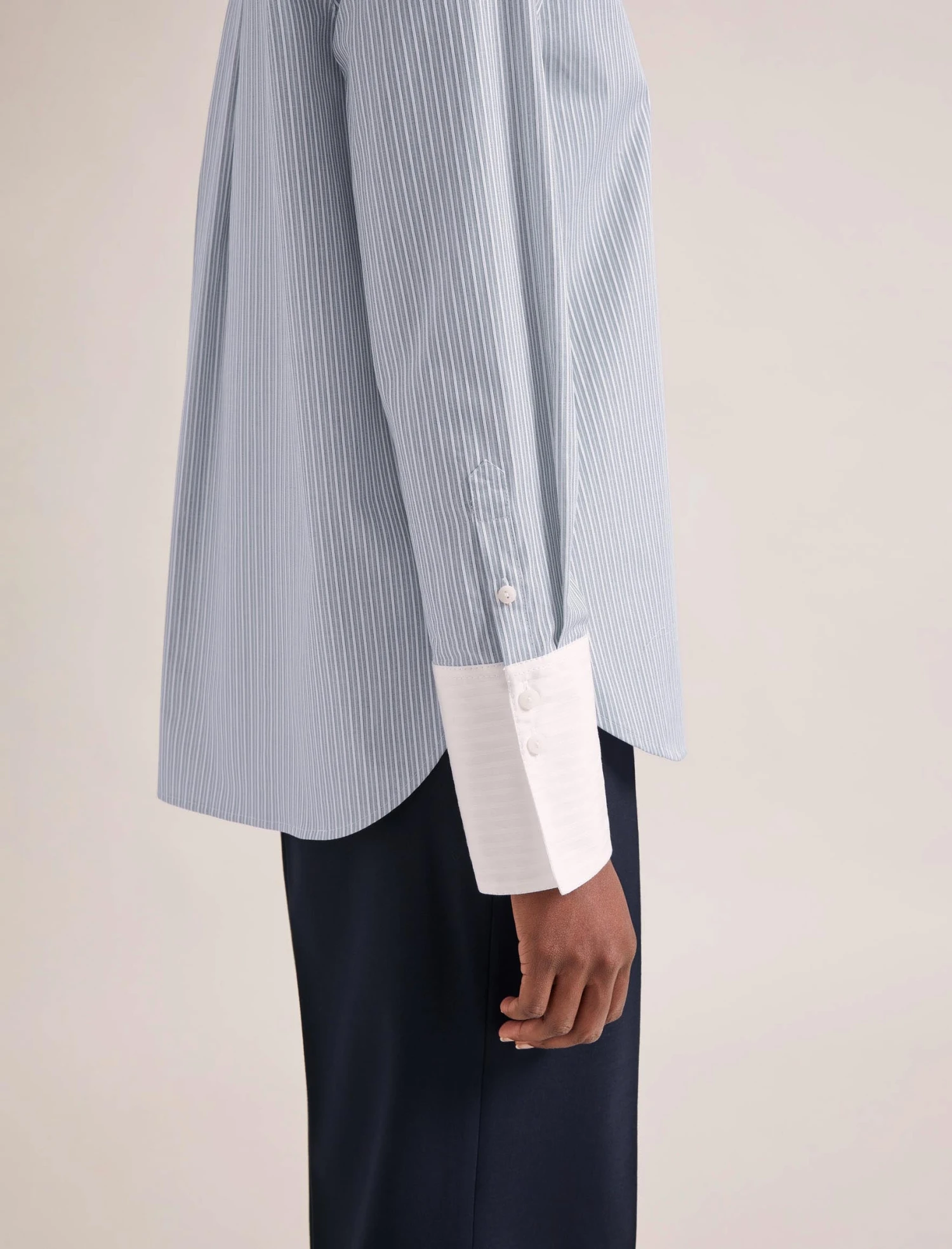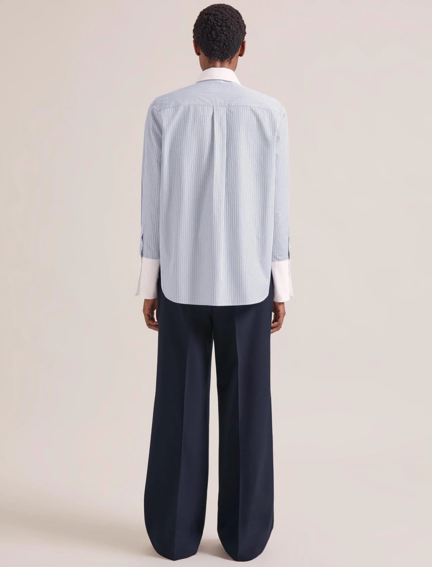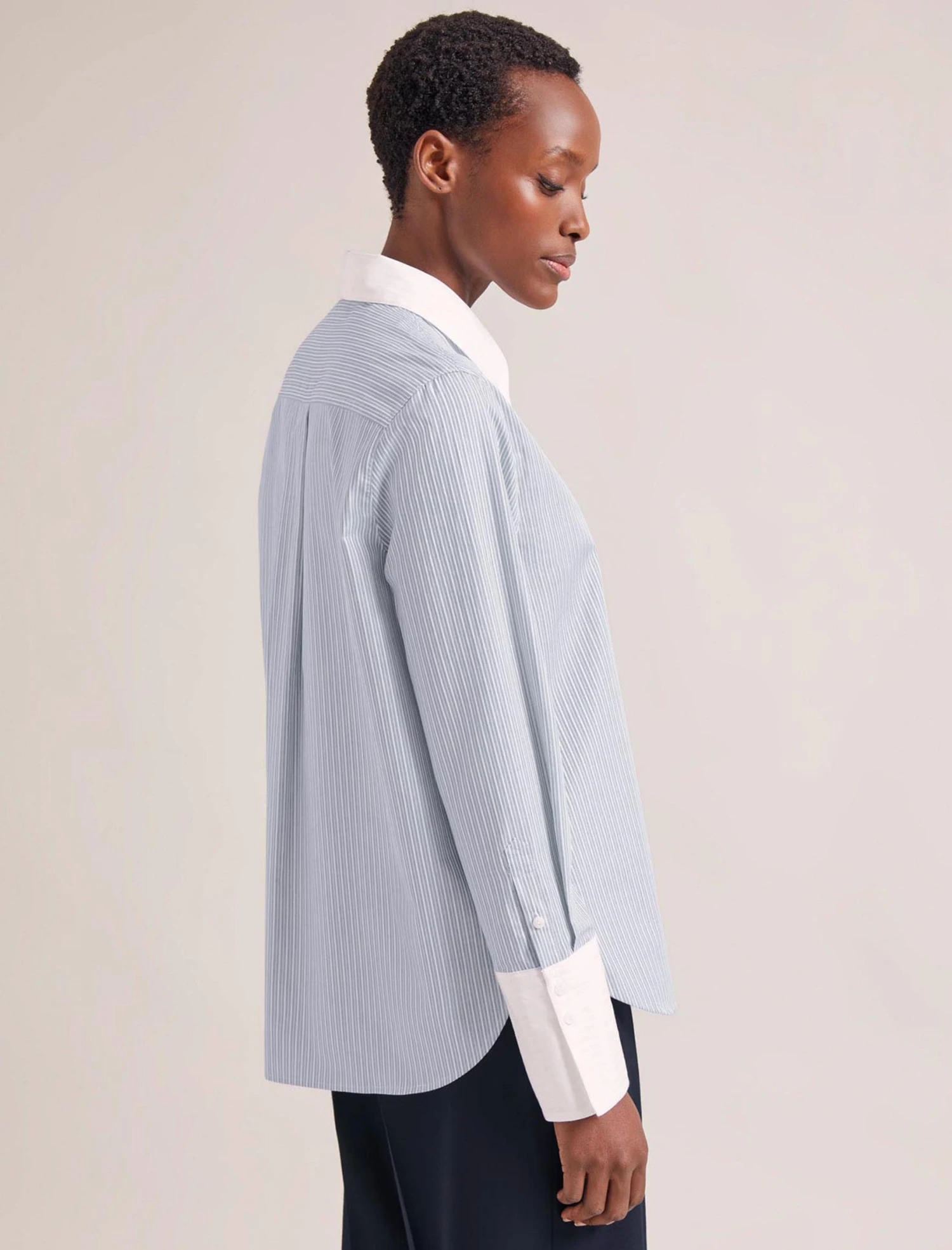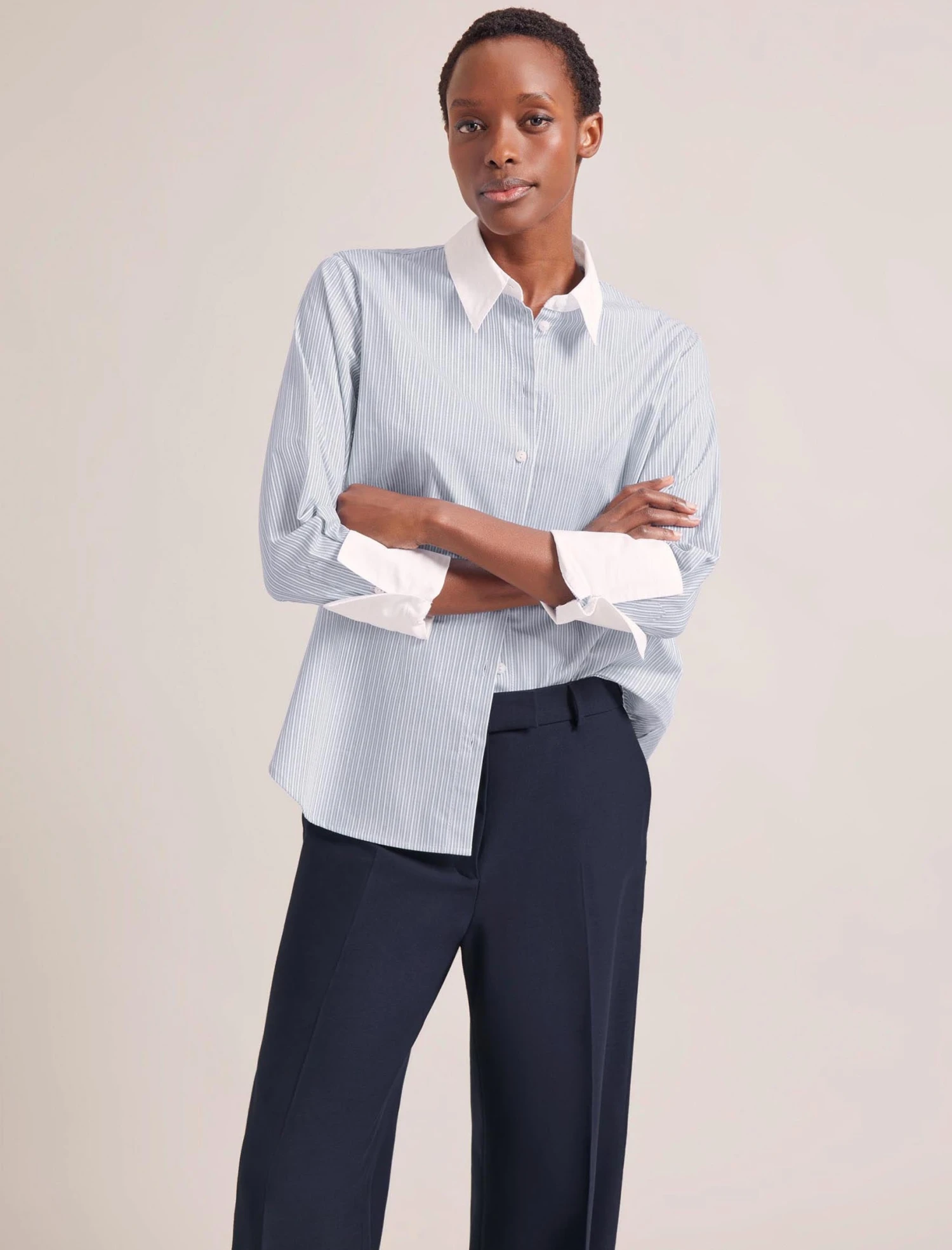 Who doesn’t love a striped mannish shirt? Shaking off any corporate connotations, our new organic cotton shirting has a luxe feel and crisp handle. Seymour’s jacquard stripe, contrasting collar and oversize turn-up cuffs add a contemporary twist to the classic shirt. Wear done-up with denim or wide-leg trouser, or partially undone with a vest and tailoring.
