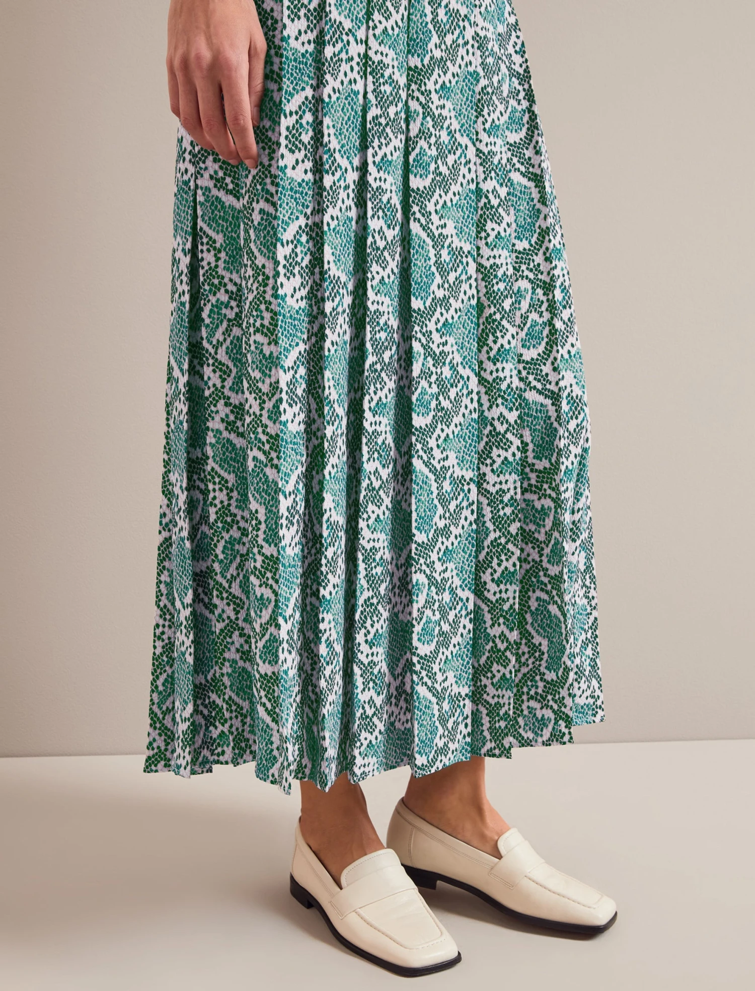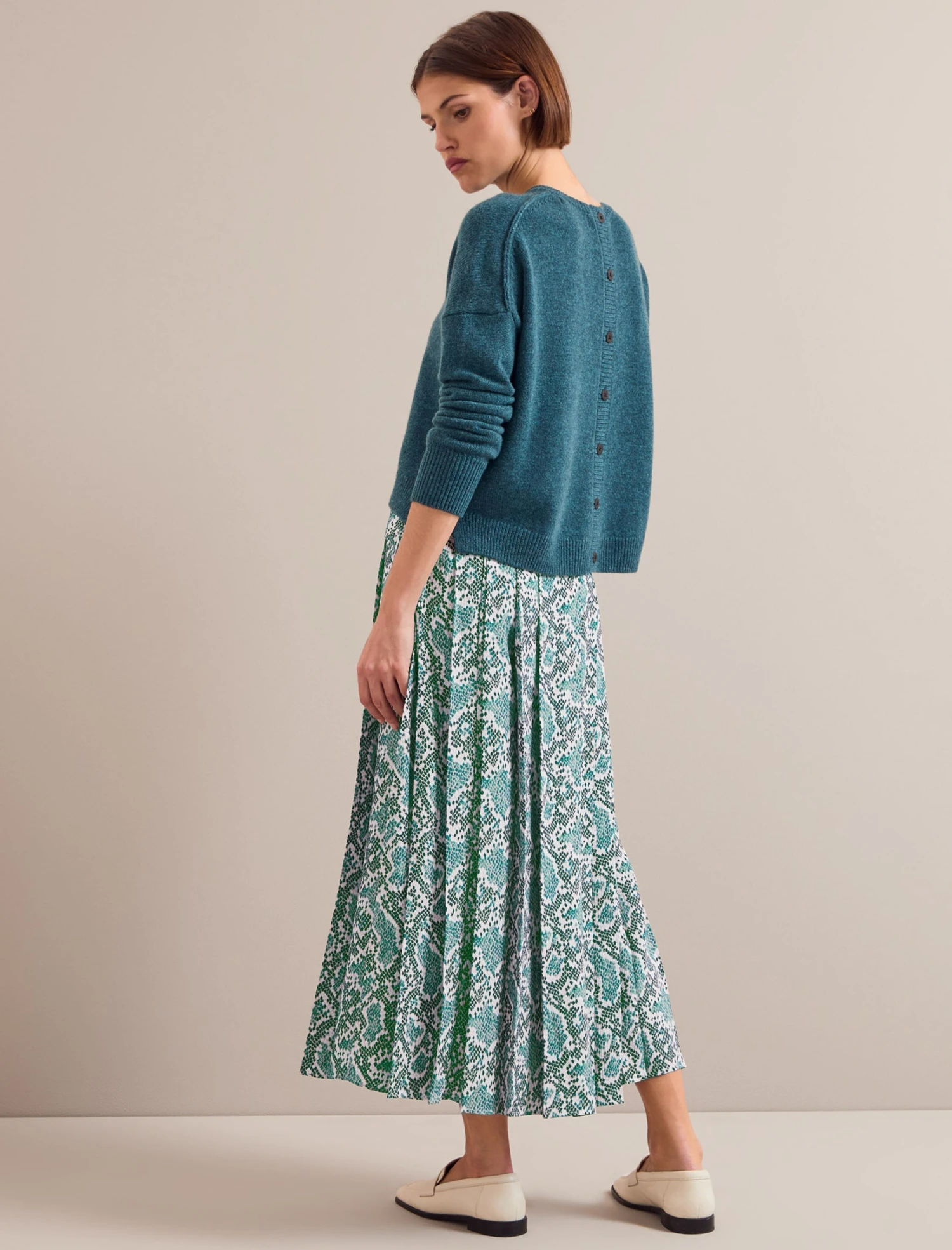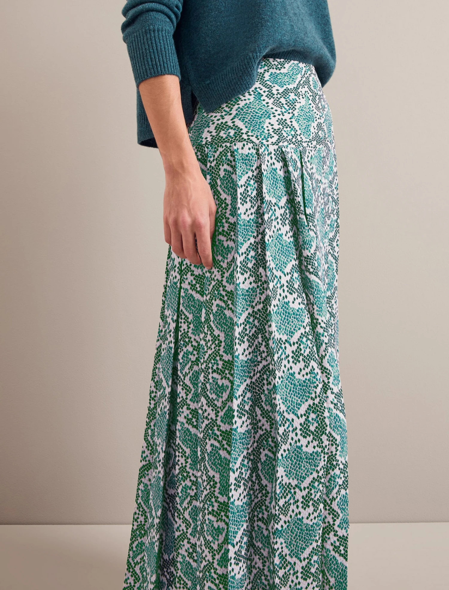 Our much-loved Sienna skirt is back in a recycled hammered crepe with a contemporary snakeskin print that partners perfectly with our cashmere knits, silk blend tees and more. Permanently pleated and machine washable, it’s as easy to look after as it is to style. Wear with a boxy Lainey jumper paired with a loafer, boot or trainer and you are good to go.