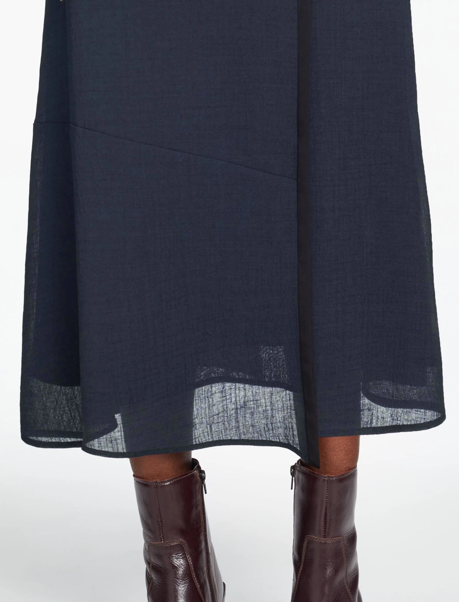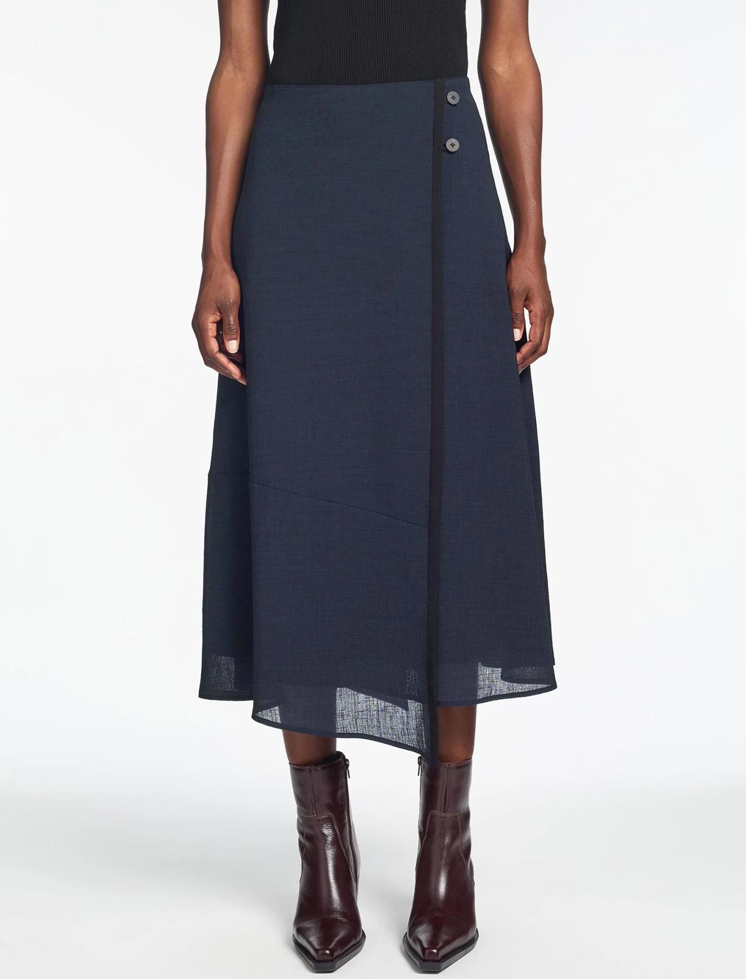 An effortlessly elegant take on a wrap skirt, Sonia is cut from Techni Voile, our crease-resistant and machine-washable hero fabric made in Japan. Its contemporary asymmetric shape is complemented by the contrast trim and twin summarys. Keep the silhouette sleek with a slim-fitting vest or T-shirt or match it with the Sullivan shirt.