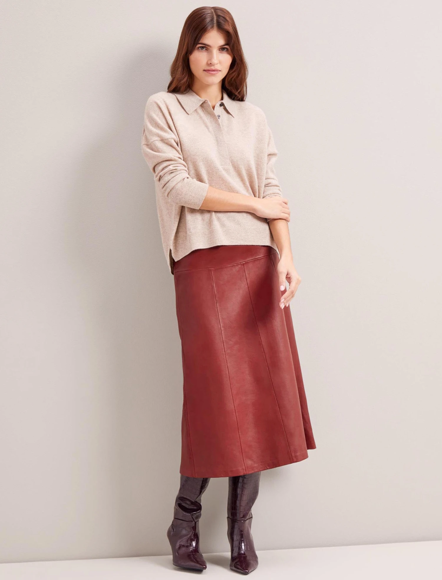 Classic, sleek and perennially stylish, our panelled butter-soft Tiana leather skirt will be one of the most versatile pieces in your wardrobe this season. Paired with a crisp white blouse or our Stella shirt and a sharp boot or point, it makes 9-5 dressing a breeze. Play to its rebellious side on downtime days with a box-fresh trainer, a vintage rock tee and undone hair.