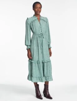 Designed in our vibrant marble print on floaty georgette, our Tilly dress is unexpectedly versatile. Machine-washable and crease-resistant, throw it on for time-pressed, run-around days, cinching the drawstring waist when you want to feel more put-together. The pops of turquoise, rust and sage green make it the ideal wardrobe pick-me-up – simply pair with a navy knitted vest that showcases the pretty frilled bracelet sleeves and a chunky boot.